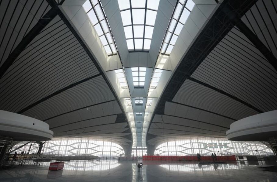 俯瞰北京大興國際機場,就像一只展翅欲飛的鳳凰,咖啡黃的外體,頭尾對稱,四翅展開,一副雄越宇宙的姿態,主要主要由航站區、飛行區、綜合交通中心等部分組成。屋頂采用了鋼網架結構,由63450根桿件和12300個球節點拼裝而成,從空中看,形成了一個不規則的自由曲面空間。