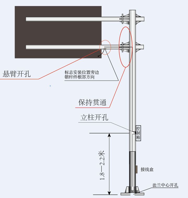 答:對于采用太陽能供電的小型點陣式主動發光標志,所配套桿件與普通標志無異;對于采用外接市電的主動發光標志,需要在懸臂下方開孔,便于標志引線進入懸臂管內;還需要在標志立柱離底部法蘭約1.8米—2.5米處開孔,安裝控制機箱,便于標志引線及外接市電入線。另若條件允許,盡量在桿件基礎旁設置一個接線窨井,便于外接線路好穿入桿件內。具體見下圖: