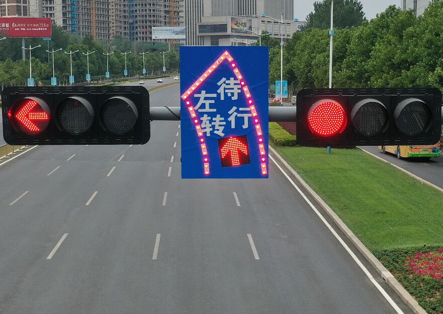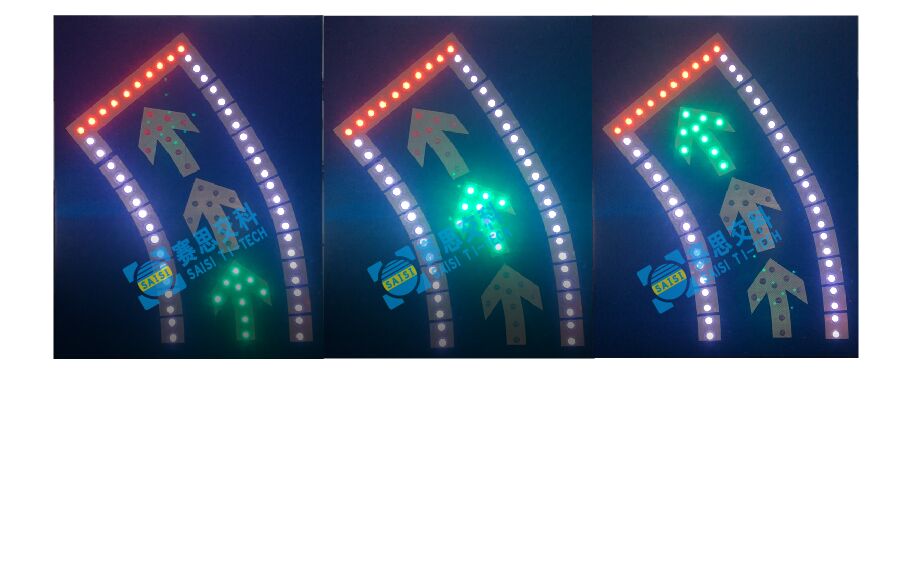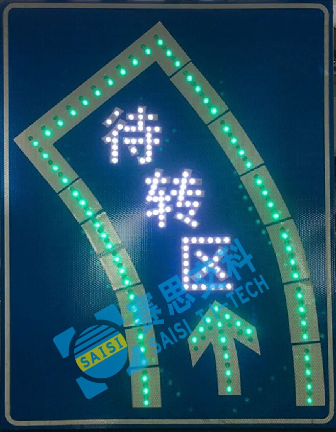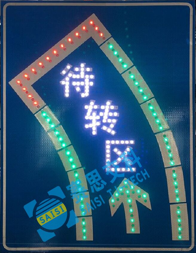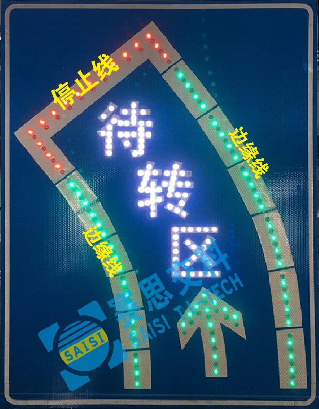 2、工藝說明:標志版面由雙色LED發(fā)光管組成邊框、箭頭圖形,和待轉(zhuǎn)區(qū)文字,通過控制模塊調(diào)取信號燈燈色狀態(tài),在標志版面形成動態(tài)三種顯示狀態(tài),動態(tài)引導待轉(zhuǎn)車流通行權(quán)限。