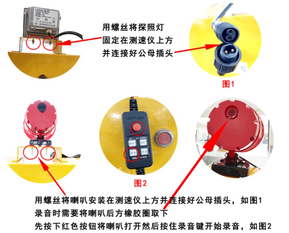 1、標志整體為立體裝置平臺,主要包括:語音警示喇叭、速度條碼顯示屏、視頻記錄攝像頭、太陽能蓄電池供電系統等設備。當被測車輛通行車速超過限制速度時,速度條碼顯示屏以紅色顯示當前車速,并啟動語音警示喇叭告知車輛以超速行駛;當被測車輛通行車速超過限制速度時,速度條碼顯示屏以綠色顯示當前車速。攝像頭全天候記錄路段動態視頻,夜間開啟補光燈。該裝置對車輛超速行駛行為有較高的警示效果、特別適用于事故易發路段、團霧頻發路段、需加強管理路段。