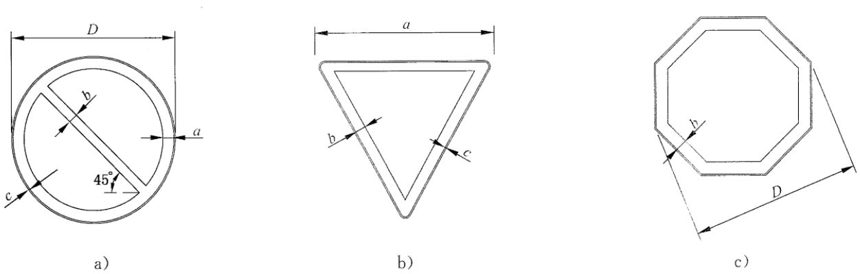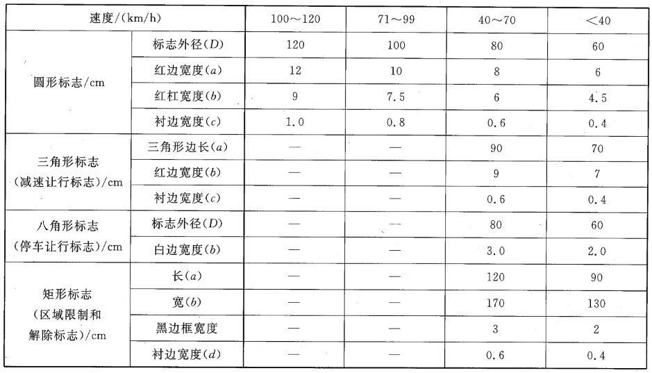 依據(jù)國標(biāo)《道路交通標(biāo)志和標(biāo)線》(GB5768.2)中所列圖案,除部分特殊標(biāo)志,常見的禁令標(biāo)志為圓型,紅色邊框、黑色斜杠。警告類標(biāo)志,具體尺寸大小根據(jù)道路設(shè)計(jì)時(shí)速而定,通常有直徑60cm、80cm、100cm、120cm等四種。參考依據(jù)如下圖所示。