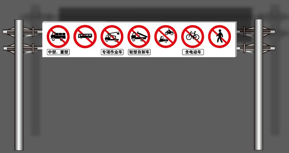 通常在重要區域的外圍路段,為限制重大型貨車進入,常常會設置限高龍門架,而龍門架的橫梁雖黏貼了反光膜,但常常處于反光膜的逆反射光錐之外,高座大貨車司機根本無法觀察到,遇到一些冒失的駕駛員,常常會發生撞擊龍門架的事故。可采用設置電光示廓標志,在龍門架橫梁上設置限高、限速等禁令標志,并采用電光輪廓標識,將橫梁的的外觀輪廓通過主動發光完全展現出來,提高遠距離的視認,規避貨車沖撞事故發生。