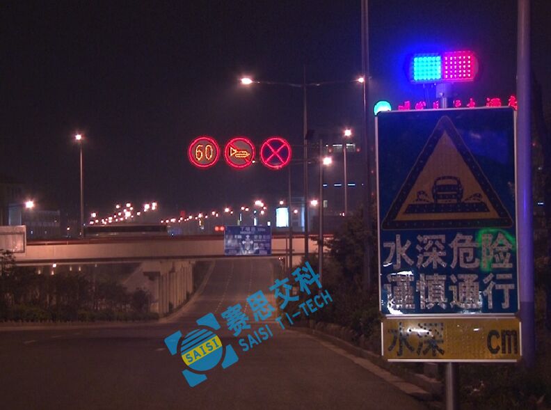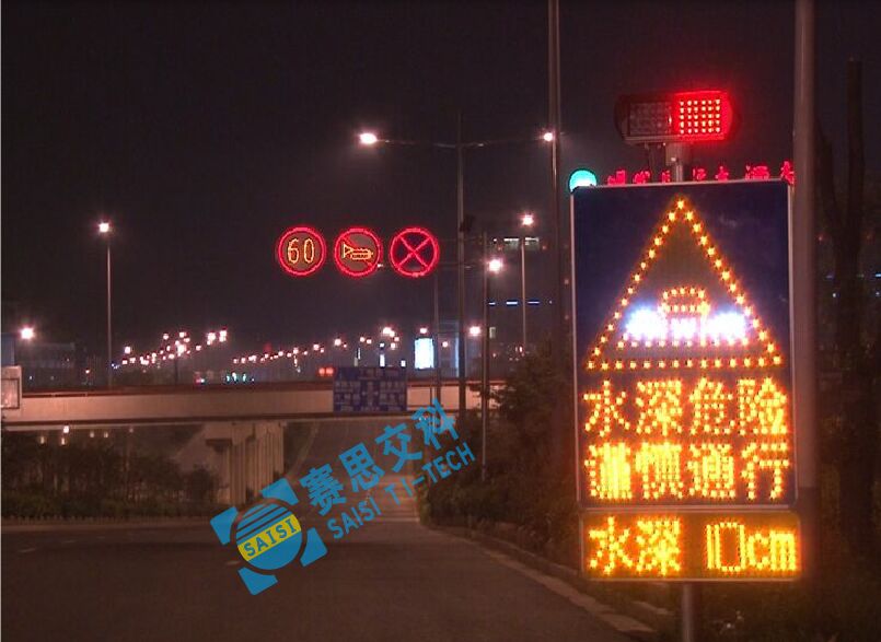 為避免以上情況發生,降低深積水對道路通行效率和駕駛安全的影響,賽康交安特開發本款專門針對積水路段、區域的積水自動感應預警標志系統。本預警標志采用太陽能供電系統,通過在低水平區域預設智能水深檢測探頭對積水區進行自動檢測,并在積水區域前方預設的主動發光警示標志中動態顯示積水深度,來告知路段交通參與者前方水深信息,便于提前作出繞道行駛或可以通行的駕駛決策,以提高通行效率和駕駛安全。