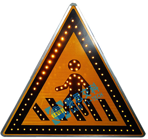 (二)標志、標線設置。設置了行人過街斑馬線的上游30—50米范圍內應設置“人行橫道指示標志”,安裝面角度向道路中央線傾斜角度,以保證司機有充分的觀察視角,不得被遮擋,可根據需要設置主動發光標志,提高全天候視認效果,和夜間的遠距離視認性,同時也能加強標志的信息突顯性,增強司機的及時捕捉、發現的概率。