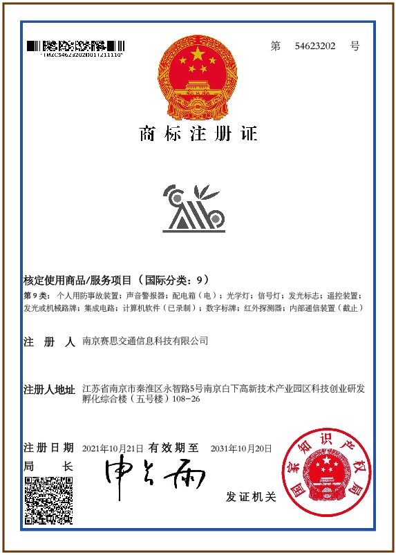 我司(賽思交科)的新“公司LOGO(商標)”已于2021年10月21日通過國家知識產權局成功審核,并獲得商標注冊證(證書編號:第54623202號),有效期至2031年10月20日,有效期10年。如下圖: