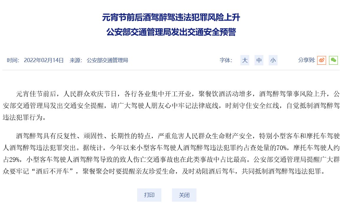 明天就是元宵節(jié),春節(jié)年假最長(zhǎng)的企業(yè)單位、個(gè)體工商戶,也將陸續(xù)開(kāi)工開(kāi)業(yè),出現(xiàn)扎堆的聚餐團(tuán)聚活動(dòng),按以往經(jīng)驗(yàn),元宵節(jié)前后,酒駕醉駕等肇事風(fēng)險(xiǎn)明顯上升。為此,公安部交通管理局于2022年2月14日,特別發(fā)文《元宵節(jié)前后酒駕醉駕違法犯罪風(fēng)險(xiǎn)上升,公安部交通管理局發(fā)出交通安全預(yù)警》,旨在提醒廣大駕駛?cè)伺笥研闹欣斡浄傻拙€,時(shí)刻守住安全紅線,自覺(jué)抵制酒駕醉駕違法犯罪行為。