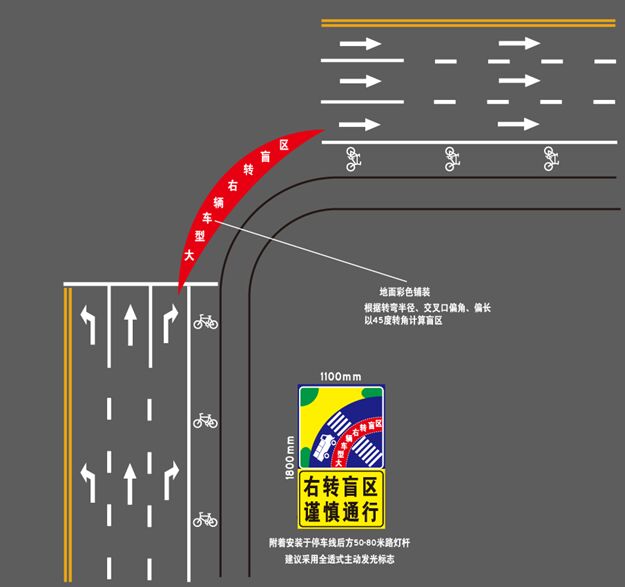 穿村鎮(zhèn)公路,不同于市區(qū)道路,肯定是在物流線路規(guī)劃區(qū)域內(nèi),貨車流量必然有所分布,而貨車駕駛存在一個(gè)最大的操作性隱患,即:“大貨車右輪視距盲區(qū)”,這類專題,很多專業(yè)論文及“公眾號(hào)”都有專文闡述,此處不在詳述。推薦部分發(fā)光標(biāo)志版面如下: