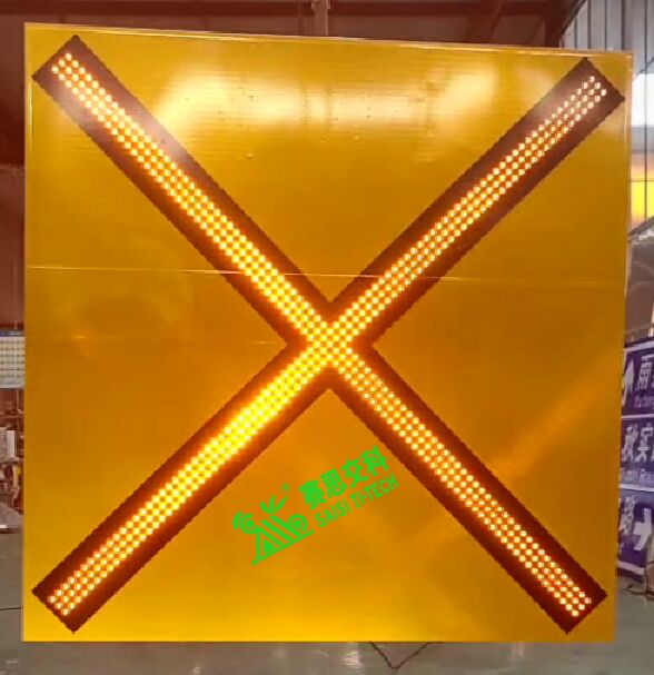 發光禁航標志的整體形狀為方型,版面為黃色底膜,黑色叉形圖案,通常采用2000mm*2000mm,或2400mm*2400mm尺寸;主要設置于橋孔上方,表示該橋孔僅為對向航道通航方向,本方向為禁航方向,不得通行。根據國標《中國海區可航行水域橋梁助航標志》(GB 24418)的技術要求,版面圖標如下: