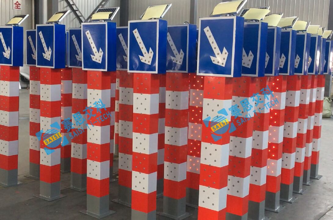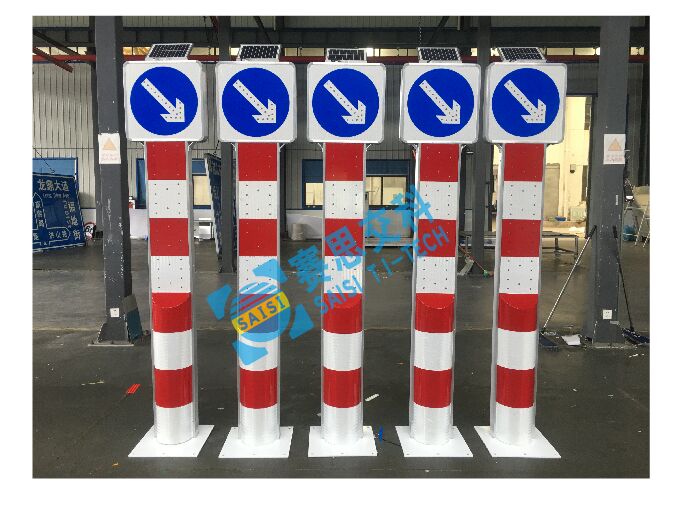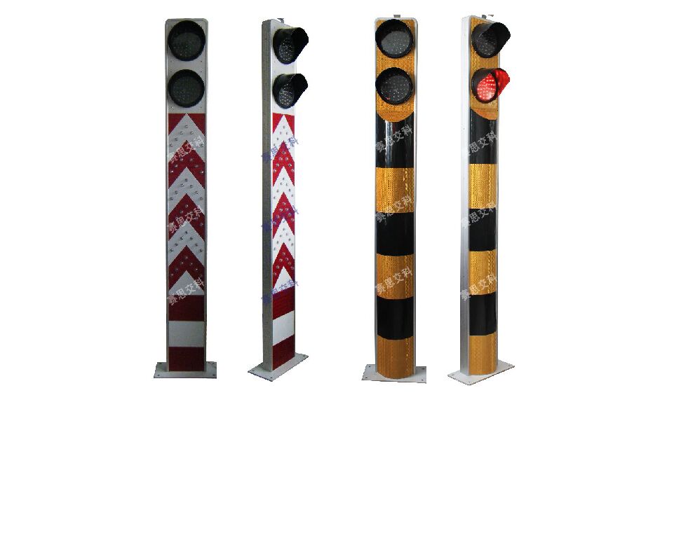 2、基本說明:采用一體式柱體結構,標志版面圖案中嵌入LED發光管,柱體上設置警示發光管,采用太陽能蓄電池供電,設置于中央隔離帶端口。