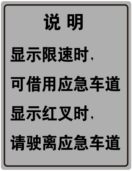 5、標志版面:“應急車道”為共用版面,另圖案“紅叉”與“限速禁令”版面二合一。